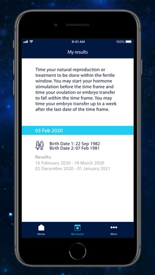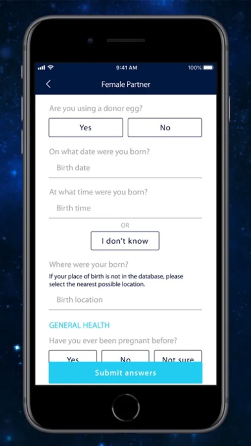 Many couples struggling with infertility will have to make a decision about when to have treatment, whether or not that treatment is IVF, Artificial Insemination, or a home plan. Time needs to be taken off work and plans need to be shifted. Very often a large part of the stress involved is who decides when to cycle. This app hopes to make this decision really easy by giving couples the next three best potentially lucky times in which to try to conceive. Couples will enter their birth time, date and place into the app, fill out a short medical questionnaire and within minutes the app will give a page of results of the these times, listed in chronological order. The app will take both charts into consideration and the results will be a combination of the birth data entered. The medical questionnaire will prompt any necessary medical considerations, tests and treatments that might need to take place before conception can be attempted.