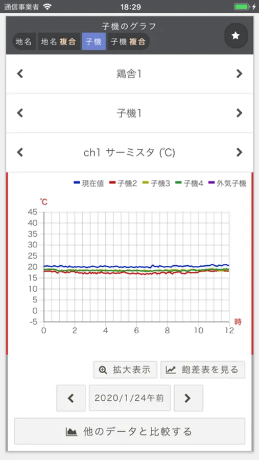 鶏舎内の温度や湿度、CO 2 濃度などの鶏舎内環境データを蓄積し、リアルタイムでも確認することができます。