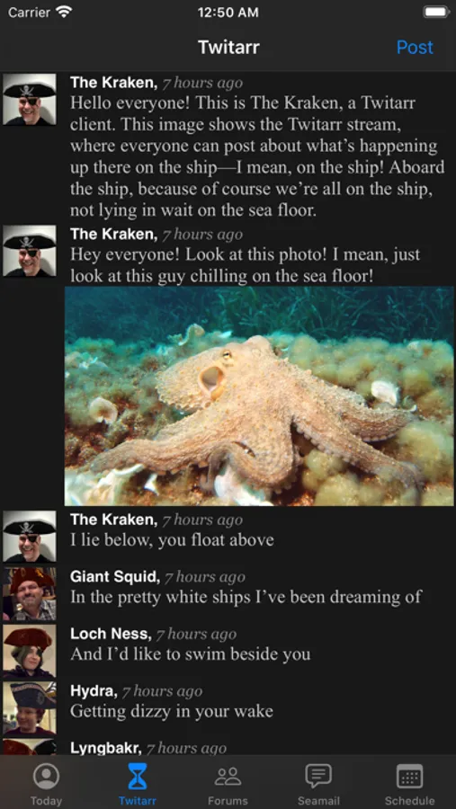 This app works with Twit-arr, the JoCo Cruise onboard social media server. In addition to all the great Twit-arr features, The Kraken gives you: