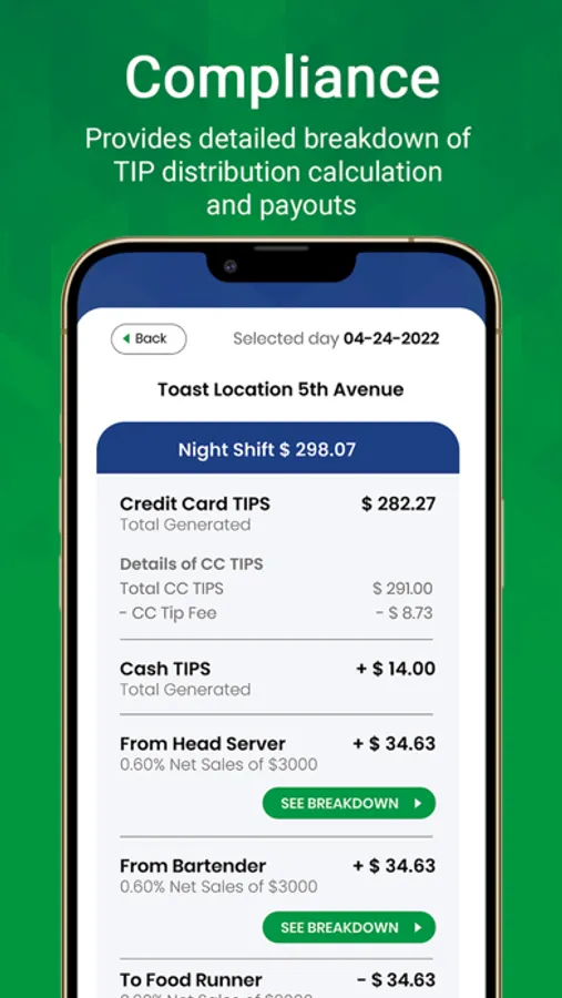 Automated processing of PayDay for daily earnings, TIPS, Time/Attendance and Wage Management Software as a Service, which calculates, allocates and pays out TIPS, Commissions, Service Charges, and manages your hours worked and give employees the power to create a payday the same day they work.