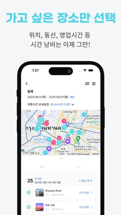 원하는 장소를 장바구니에 담기만하면, 자체 개발 AI엔진이 위치, 동선, 영업일, 영업시간, 식사시간, 장소 간 이동 시간 등을 고려하여