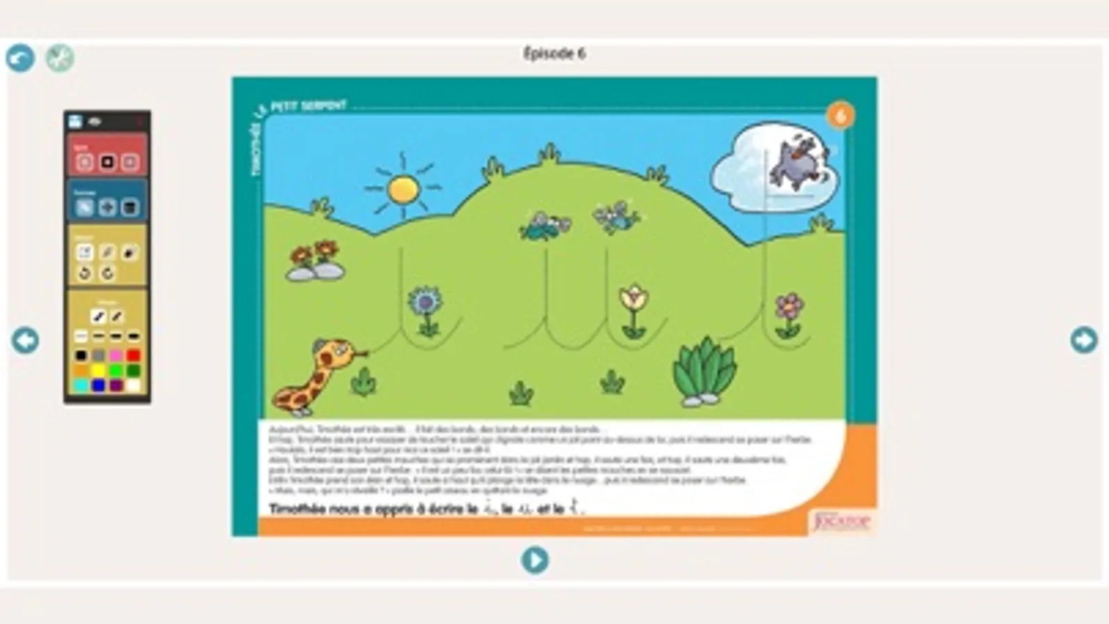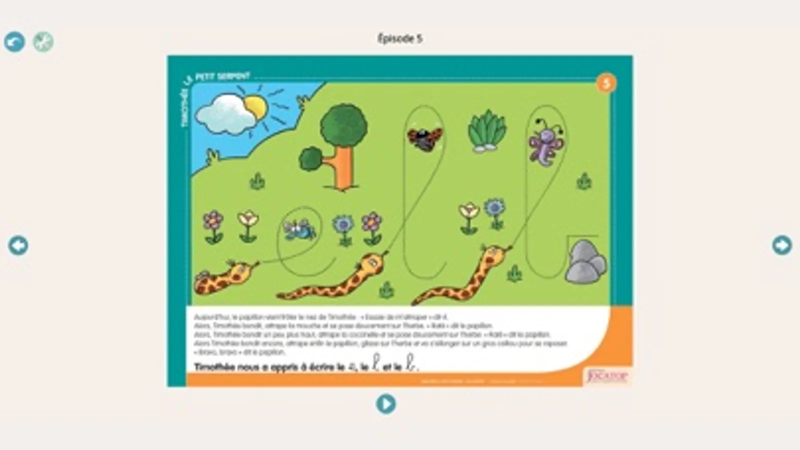 Timothée le petit serpent se promène dans son jardin. Ses rencontres, ses jeux, ses déplacements expliquent le tracé des lettres cursives aux élèves.