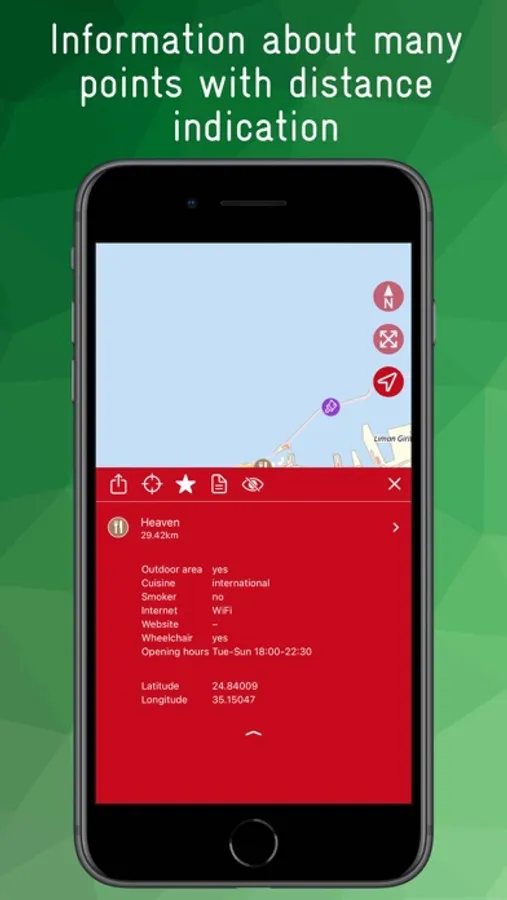 For many POIs there is further information such as opening hours, address, disabled access, ... Notes or favourites can be created for each POI, a history list shows the most recently used POIs, content can be shared.