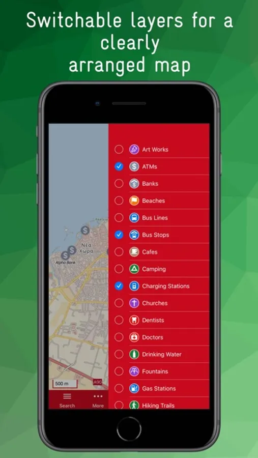 POIs are grouped into categories and can be displayed as layers. For example, you can display all restaurants, public transport lines, banks, hiking trails, charging stations and doctors on the map. The size and overlap of the icons can be adjusted to improve clarity.