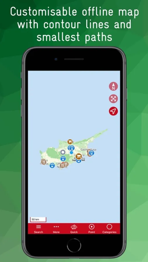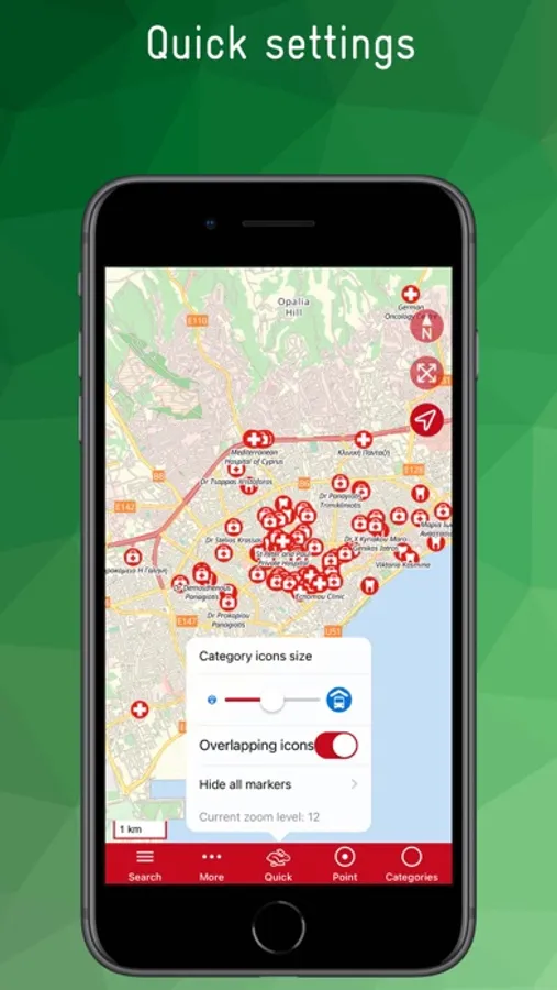 POIs are grouped into categories and can be displayed as layers. For example, you can display all restaurants, public transport lines, banks, hiking trails, charging stations and doctors on the map. The size and overlap of the icons can be adjusted to improve clarity.