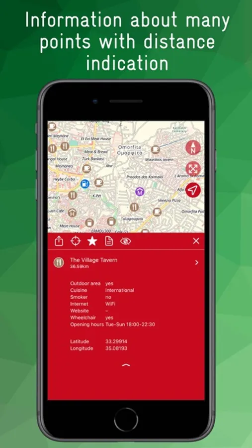 For many POIs there is further information such as opening hours, address, disabled access, ... Notes or favourites can be created for each POI, a history list shows the most recently used POIs, content can be shared.