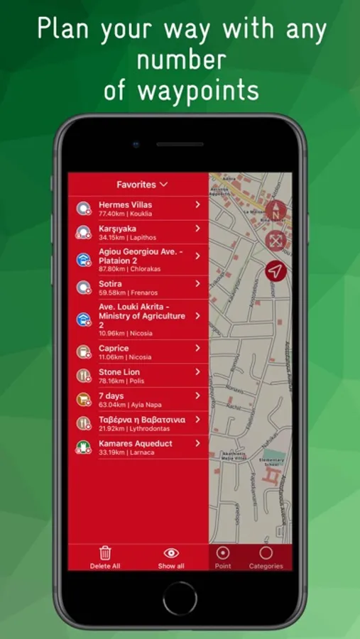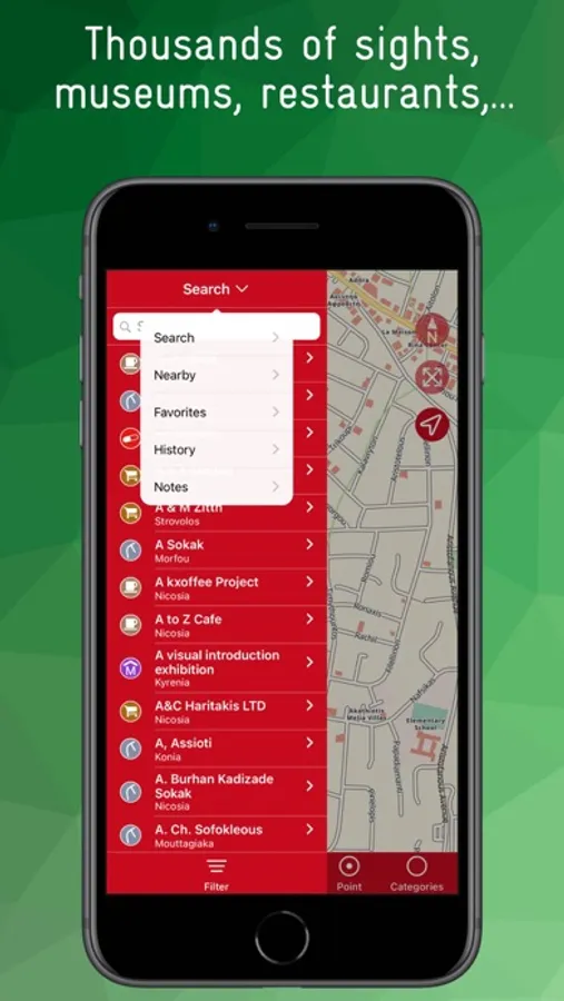 An integrated database allows you to search for POIs as well as a large number of streets, towns, villages, districts, etc. The search can be filtered by category and/or distance.
