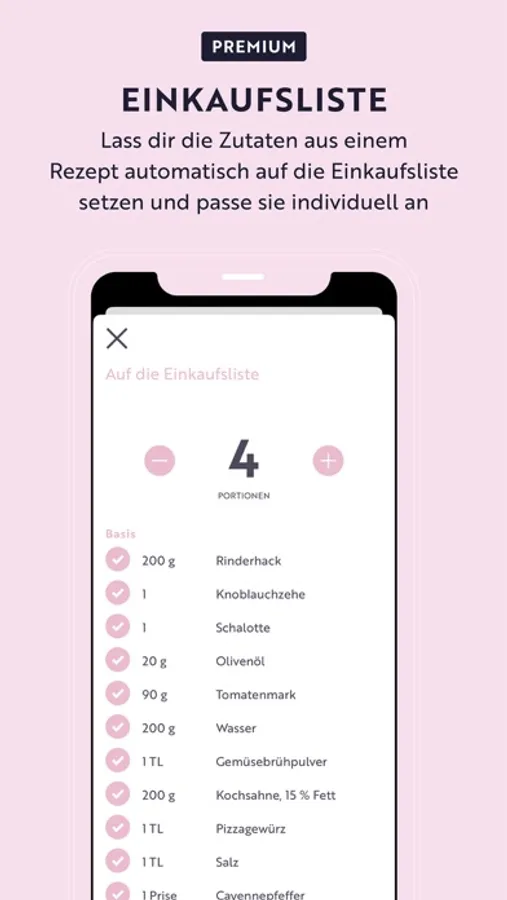 [+] Nutzt die smarte Einkaufsliste und lasst euch alle Zutaten eines Rezeptes automatisch auf die Liste setzen. Zusätzlich könnt ihr die Liste individuell anpassen oder direkt selber erstellen. Zudem könnt ihr sie als Textnachricht versenden