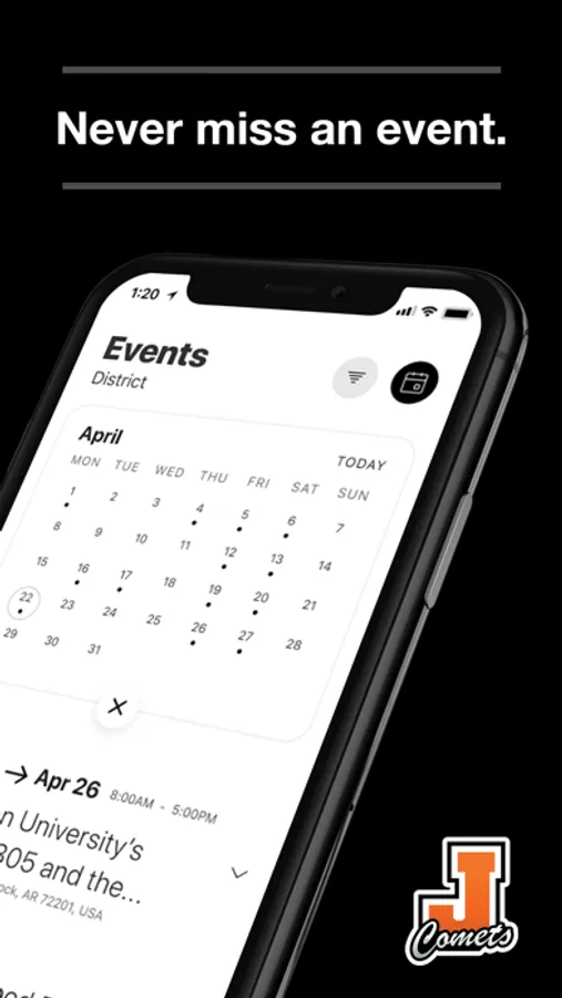 The event section shows a list of events throughout the district. Users can add an event to their calendar to share the event with friends and family with one tap.