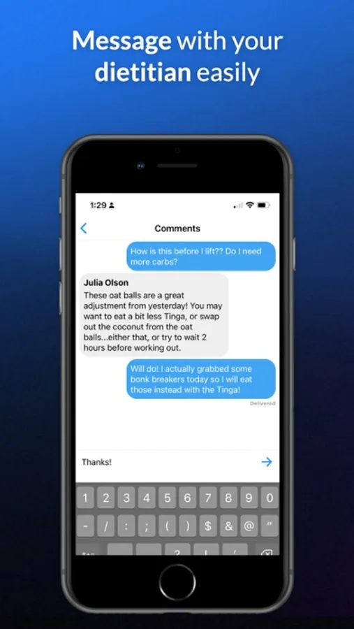 The athlete receives commentary on their food log directly from their team dietitian, with push notifications and in-app notifications used to deliver the information.