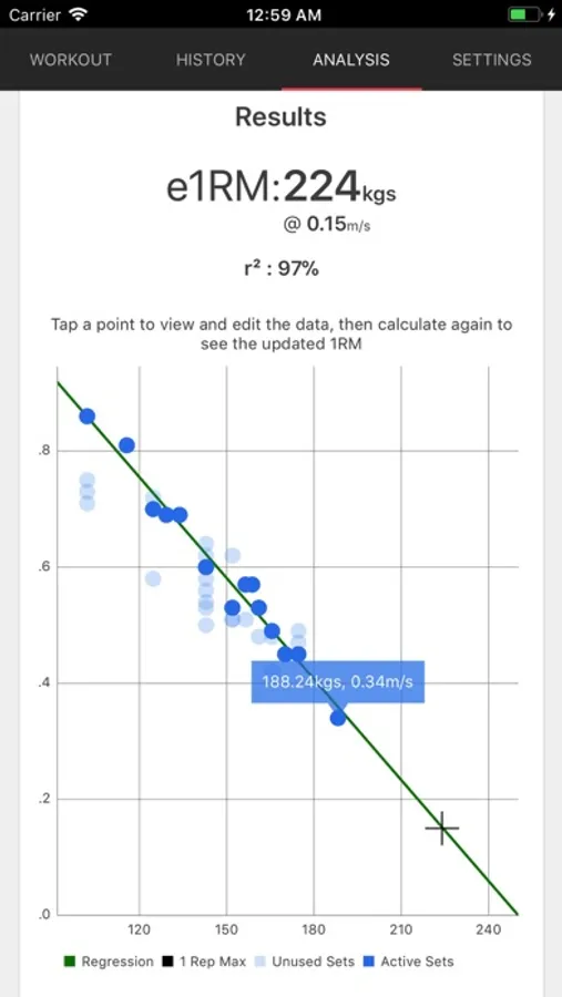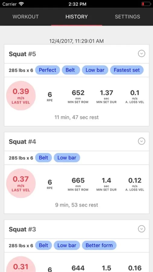 See all your workout data including average velocity, peak velocity, peak height, range of motion, and duration, as well as time between sets and number of reps. You can add context to your sets, like tags describing exercise variations or unique attributes, training videos and video logs, and RPE. You can view analysis of your data through advanced metrics like peak end of a metric in a set, absolute loss of a metric in a set, and your estimated one rep max.