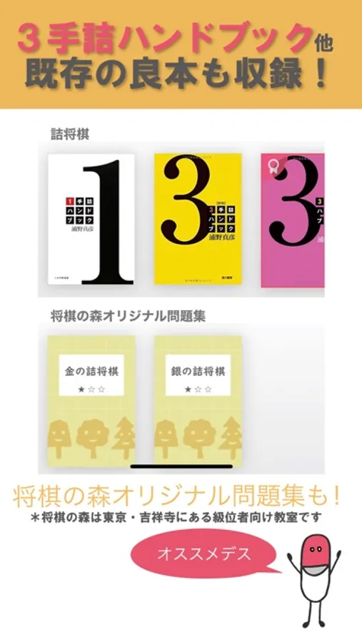 ・このアプリのためにプロ棋士(小林宏七段、高田尚平七段、高橋和女流三段)が作成した「将棋の森」オリジナル問題集も多数収録!