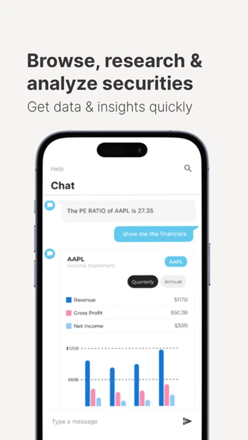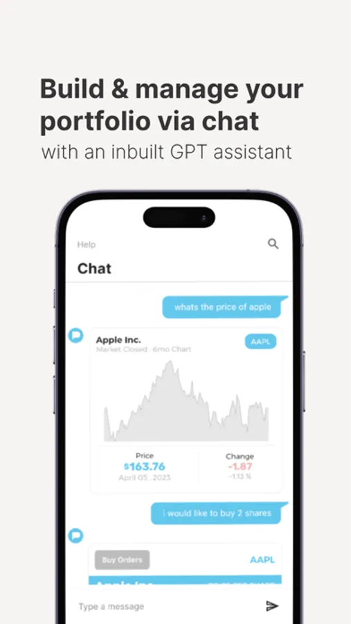 Pasiv's chat function makes it easy for beginners to get started with investing in stocks. Have a question about the stock market? Simply ask for it in the chat. "What is a dividend?". Want to buy a company's shares? Simply type "Buy 2 shares of...". Want to research about an index fund? Simply ask for more information about it. Pasiv will execute trades for you in the chat and respond with financial data when you ask for it.