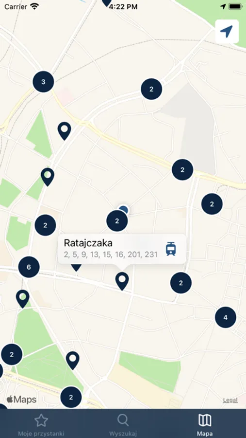 Moje przystanki - lista przystanków dodanych do ulubionych i lista najbliższych przystanków wybrana po lokalizacji użytkownika. Umożliwia szybki dostęp z głównego ekranu aplikacji, dzięki czemu jedno kliknięcie wystarczy, aby sprawdzić godziny odjazdów.