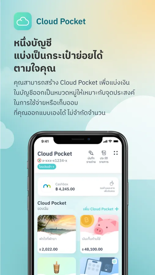 1. Cloud Pocket: หนึ่งบัญชี แบ่งเป็นกระเป๋าย่อยได้ตามใจคุณไม่จำกัดจำนวน คุณสามารถสร้าง Cloud Pocket เพื่อแบ่งเงินในบัญชีออกเป็นหมวดหมู่ให้เหมาะกับจุดประสงค์ในการใช้จ่ายหรือเก็บออมที่คุณออกแบบเองได้ ไม่จำกัดจำนวน เช่น Cloud ค่ากิน, ค่าชอป, ค่ามือถือใหม่ หรือเงินเก็บห้ามใช้!