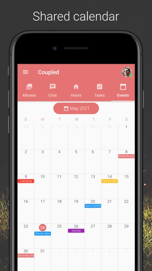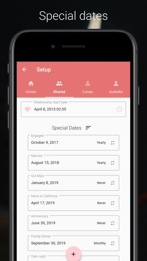 Coupled's shared calendar keeps track of your special dates, birthdays, anniversaries and events. Events in the relationship tracker can be set in the future or in the past. You'll each get a reminder when an event is close.