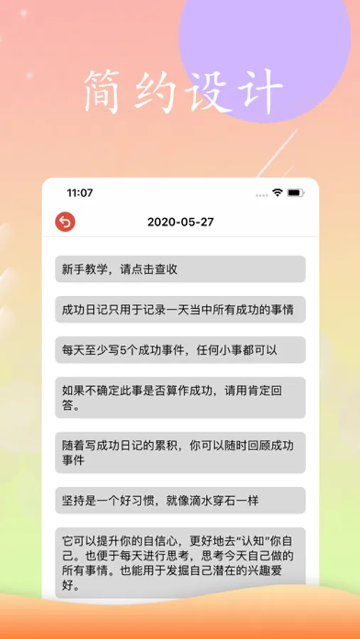 成功日记APP界面简洁清爽,没有多余的东西摆放,有助于你全神惯注写好你的成功日记。