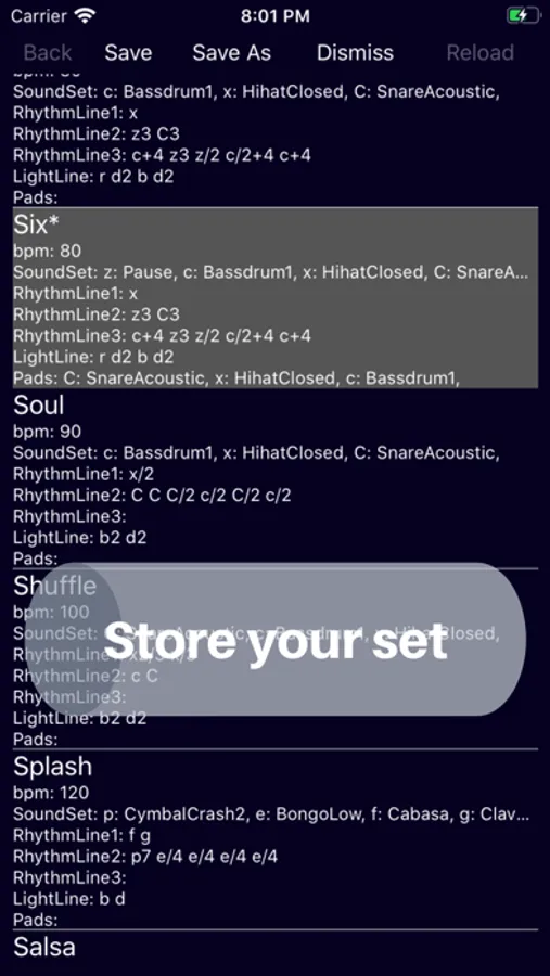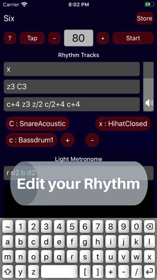 The Store allows to select a rhythm from the repository. Around 20 preset rhythms are provided. Self created rhythms can be named, added to the list and saved for later use.