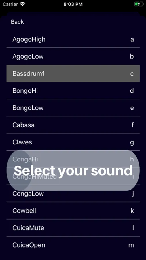 Further a surface with configurable drum pads supports drumming interaction and memorizing the drum sound letters. The pads can be added from the drum sound inventory by pressing '+', reordered by long pressing the pad and dragging and dropping, and removed with '-' if needed.