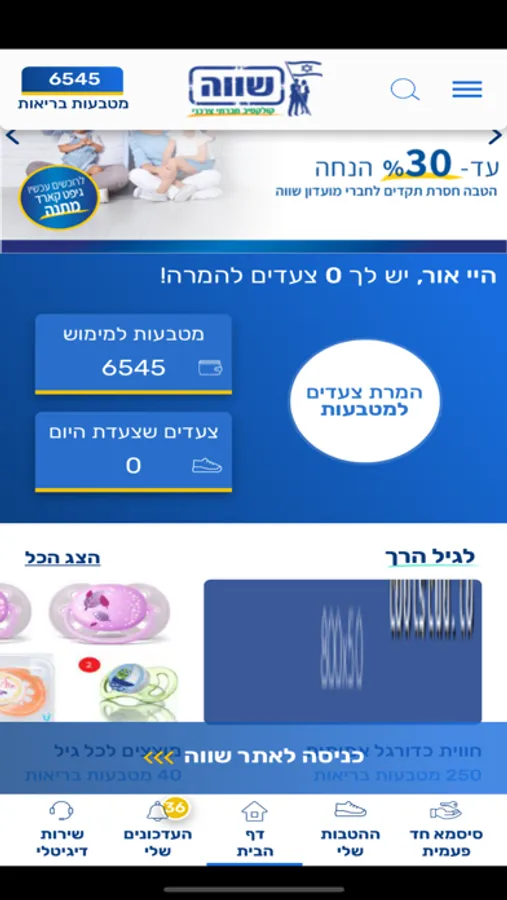 3. ספירת צעדים המזכה במתנות באמצעות התחברות ל-HEALTH APP במכשירך דרך HEALTH KIT על מנת לספור את מספר הצעדים היומיים שלך. את הצעדים תוכל להמיר למטבעות שבעזרתם תוכל לרכוש הטבות והנחות.
