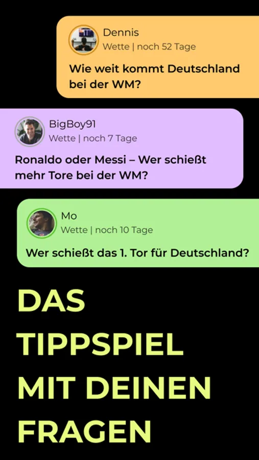 Erstelle eine ganz private Tippgruppe für dich und deine Freunde. Hier kannst du deine privaten Fragen stellen. Tippe auf Dinge, die wirklich nur du und deine Clique wissen dürfen. “Kommt Jan auf dem Sommerfest mit Ina zusammen?”, “Wer kriegt das Bier schneller auf Ex runter”? Nur ihr könnt diese Fragen sehen und darauf tippen. Aber natürlich könnt ihr auch ganz klassisch gemeinsam auf öffentliche Fragen tippen.