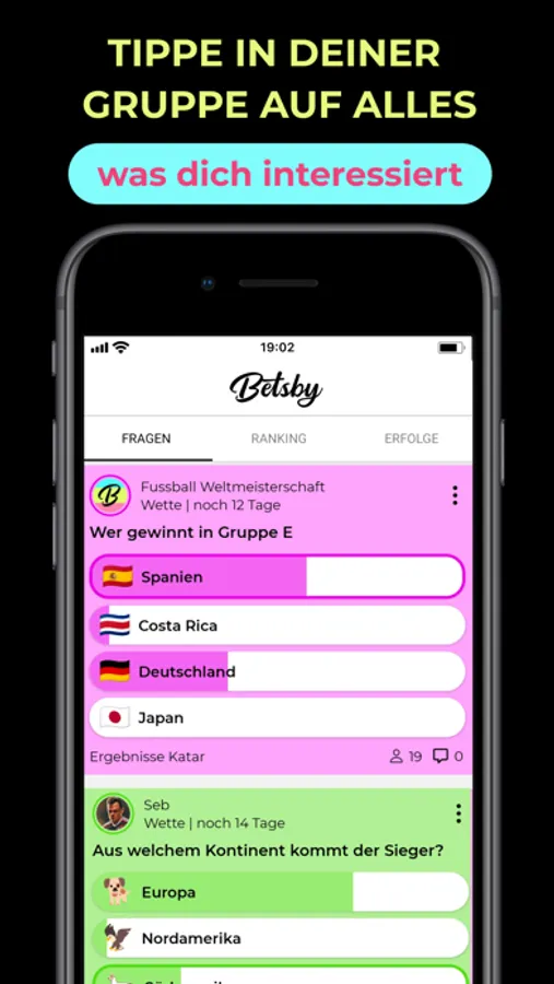 Betsby ist die erste Fußball Tippspiel App für Freunde, mit der du wirklich auf ALLES tippen kannst. Endlich kannst du nicht nur auf Ergebnisse tippen, sondern auch auf eigene Fragen, wie: