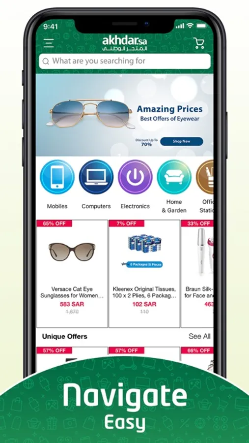 نوفر لك في اخضر باقة متنوعة من المنتجات والخدمات عبر مجموعة من الأسواق المتخصصة في مختلف المجالات تشمل الإلكترونيات، الجوالات، الكمبيوترات، الحديقة والمنزل، مستلزمات المكتب، الصحة والجمال، الطفل والألعاب، الموضة، والسوبرماركت لتلبية حاجاتكم المختلفة.