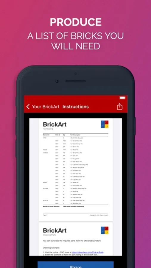 Support is provided so you can customise the dimensions of your final project. BrickArt will generate a full list of the parts you need, together with instructions you can follow to build your mosaic.