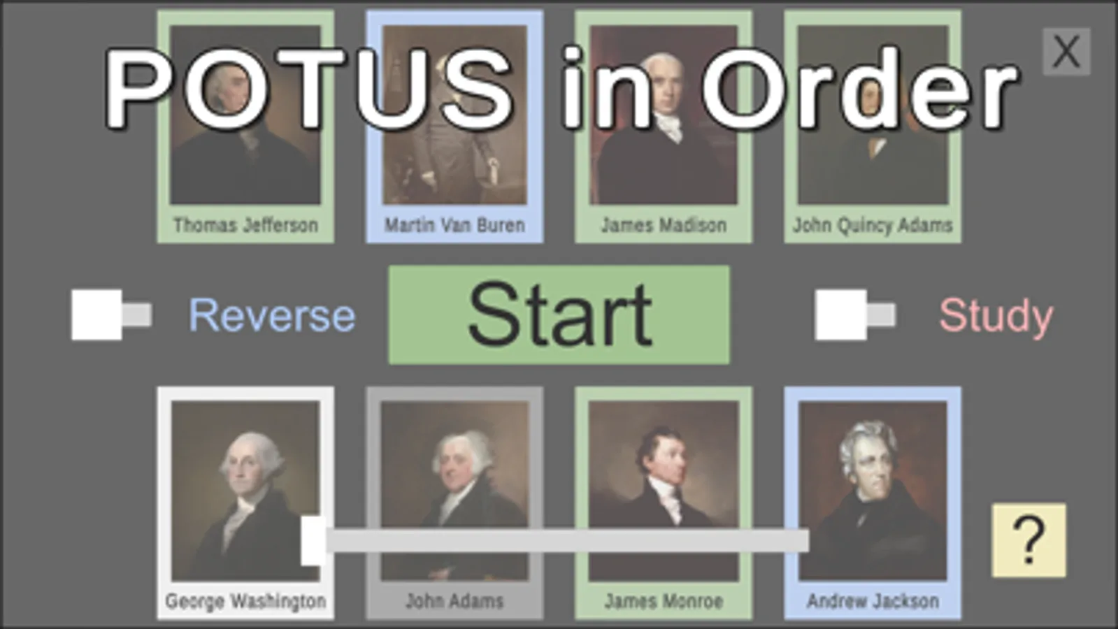 Don’t worry if you don’t know them yet or can’t get through all the presidents before 3 wrong attempts. You can switch Study mode on. The presidents will be lined up in order with facts (including their political party, years in office, terms served, and sequence number) showing. Adjust the slider to start on any page.