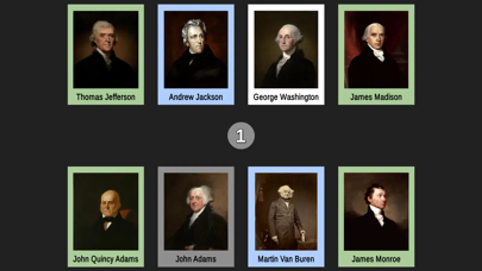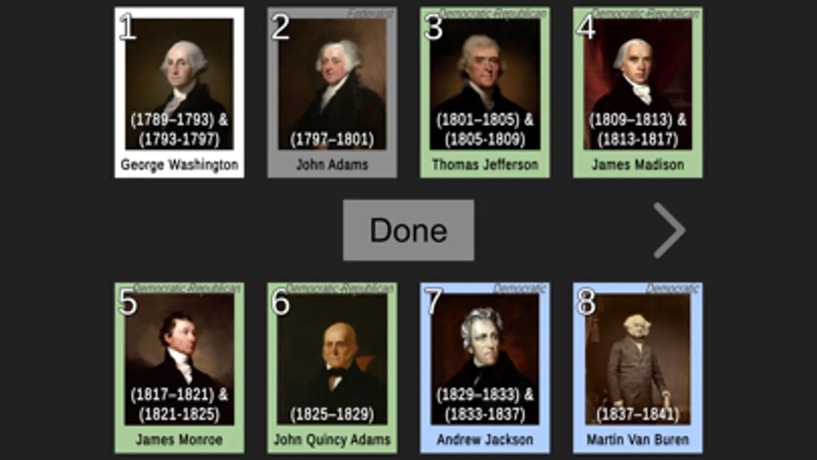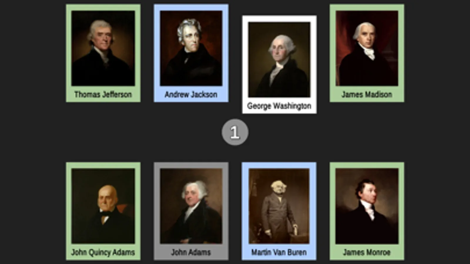 A page of cards for each of the first 8 presidents will be shown in random positions on your screen. Each card is color-coded to represent the political party and only their portrait and full name are shown. Drag the POTUS whose sequence number in the order of presidents matches the badge number in the center of the screen. For example, if the badge shows 1, drag George Washington’s card to it because George Washington is the 1st president. Complete all the presidents on the page to advance to the next set.
