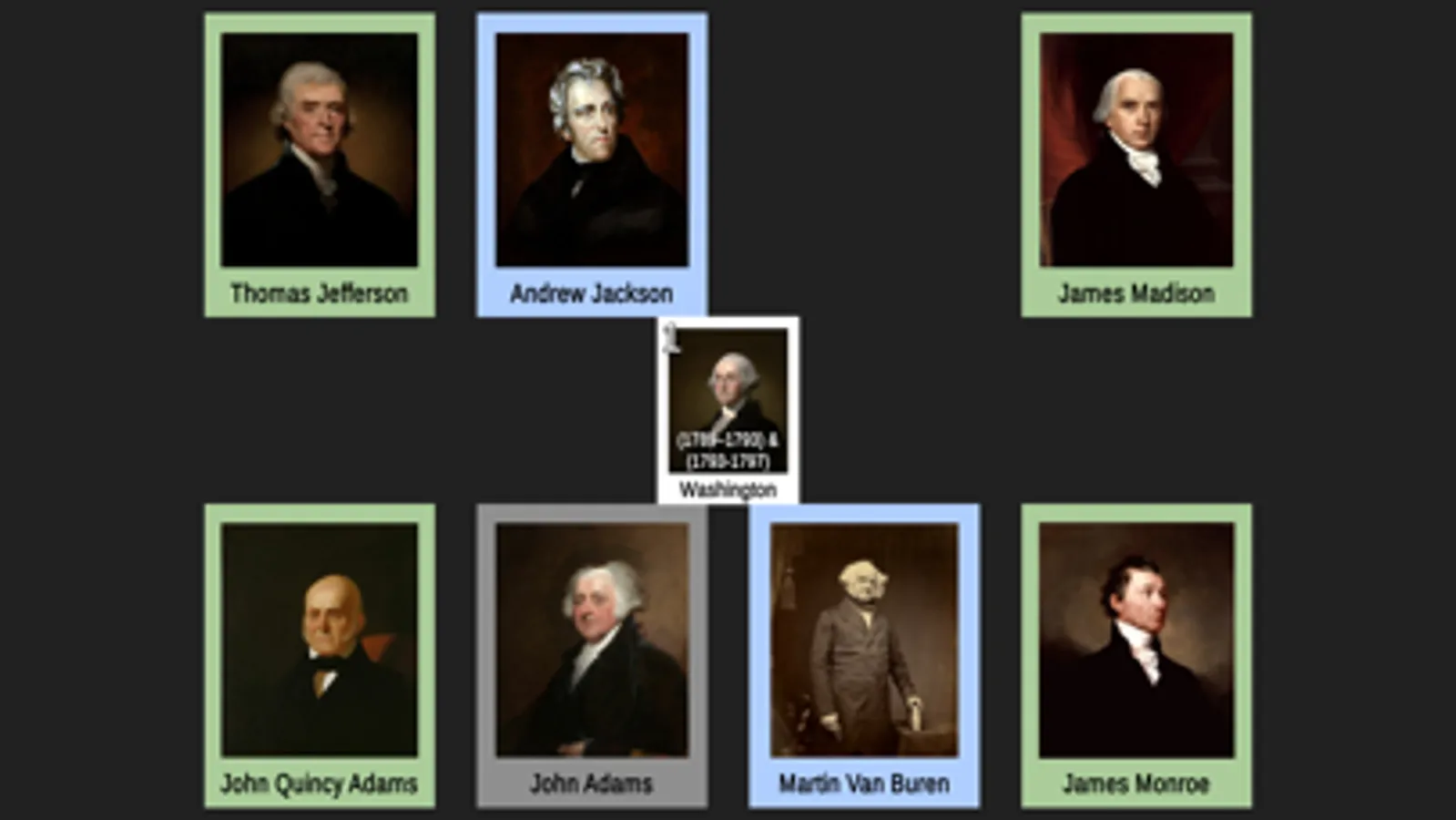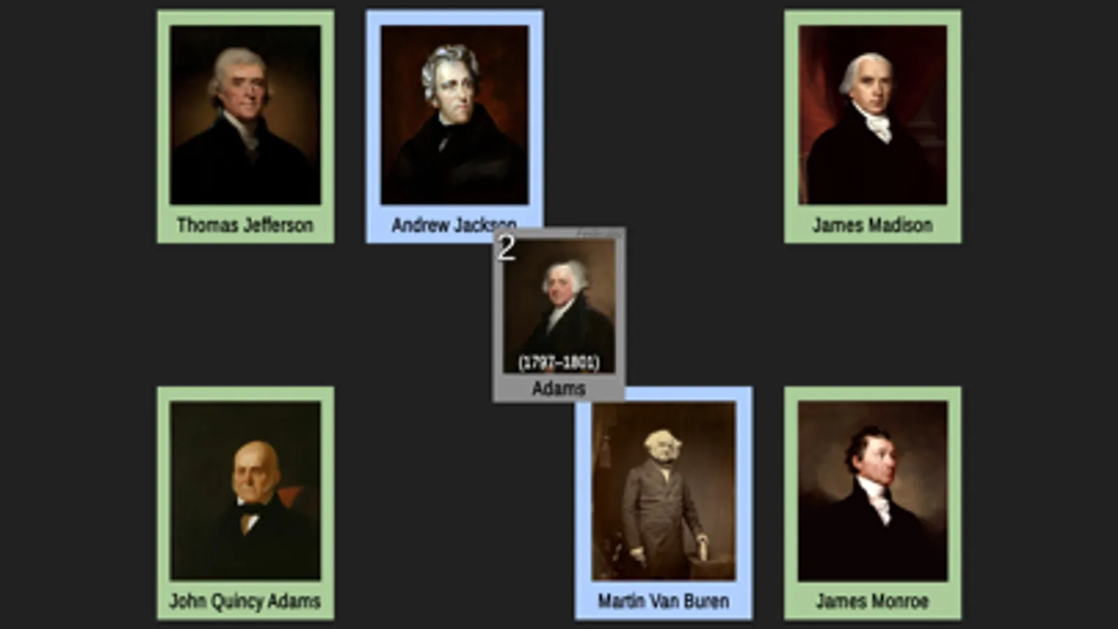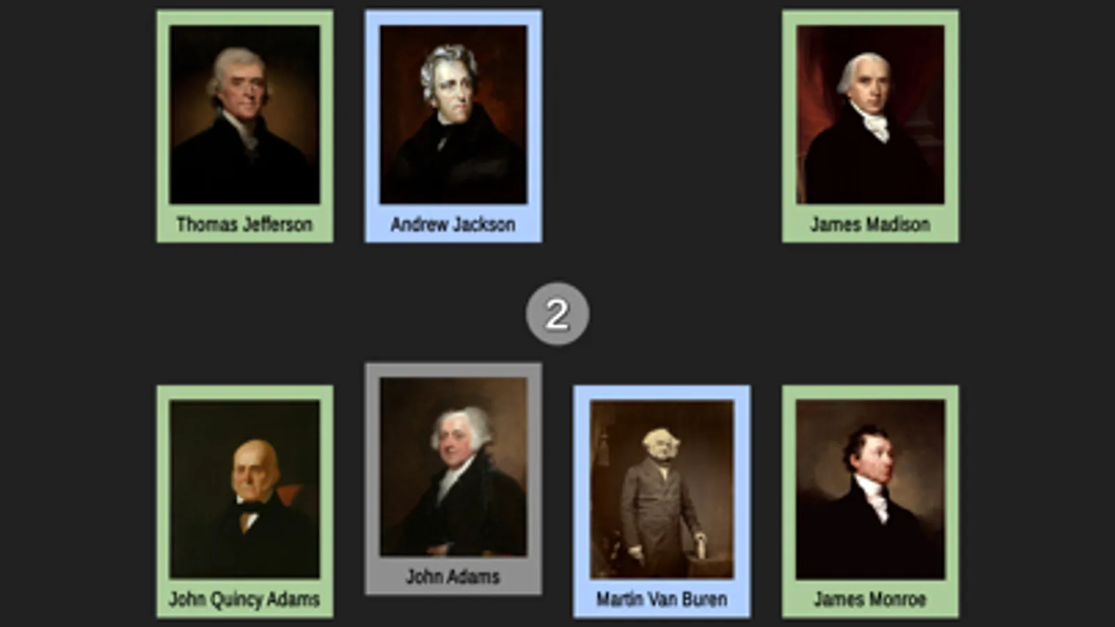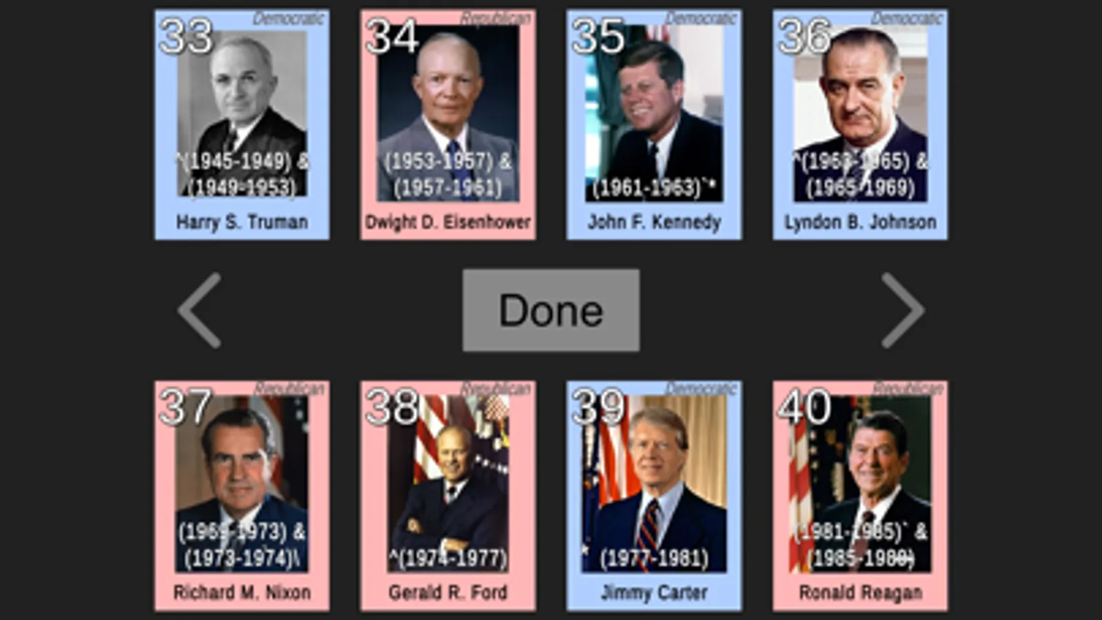 A page of cards for each of the first 8 presidents will be shown in random positions on your screen. Each card is color-coded to represent the political party and only their portrait and full name are shown. Drag the POTUS whose sequence number in the order of presidents matches the badge number in the center of the screen. For example, if the badge shows 1, drag George Washington’s card to it because George Washington is the 1st president. Complete all the presidents on the page to advance to the next set.