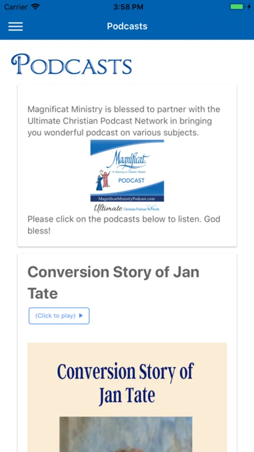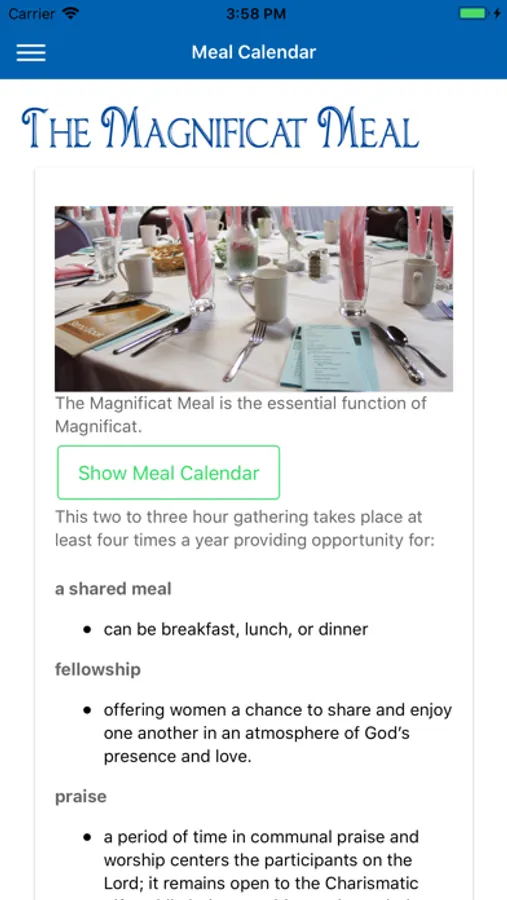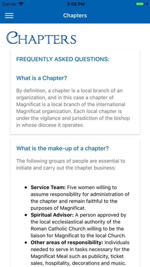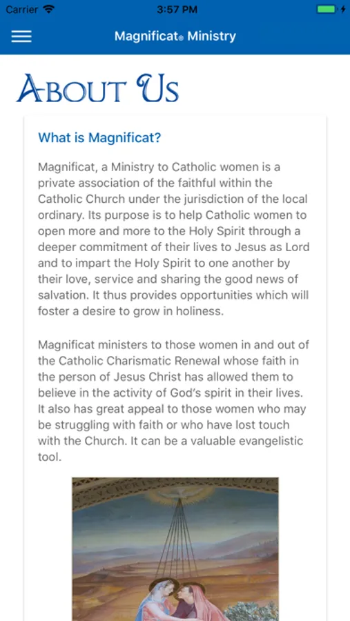 Magnificat welcomes you to our Mobile App. You can learn about the ministry of Magnificat, obtain information about our Chapters, have an introduction to the Magnificat Meal and see our Meal Calendar, and connect with our online Podcasts. Please feel free to contact the local Chapter near you if you feel drawn to become part of our Ministry.