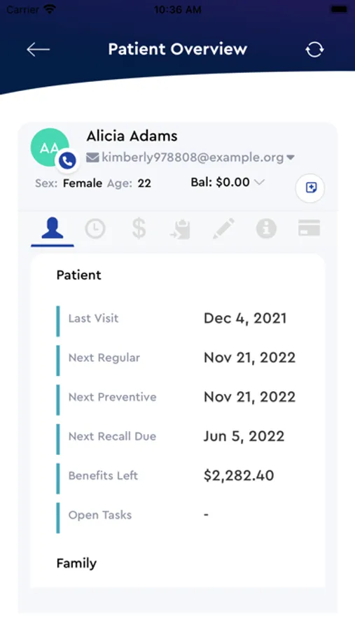 > See your patient’s key information such as outstanding balance, unfinished treatments, pending forms, unscheduled family members, and much more.