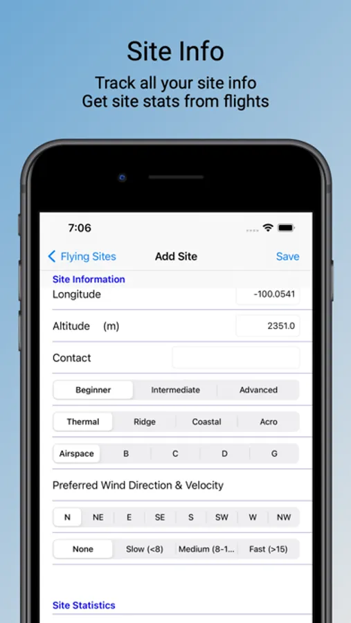Sites - keep all your sites in one handy and searchable place. Maintain site location with geolocation, wind, type, airspace's contacts and notes. Share sites