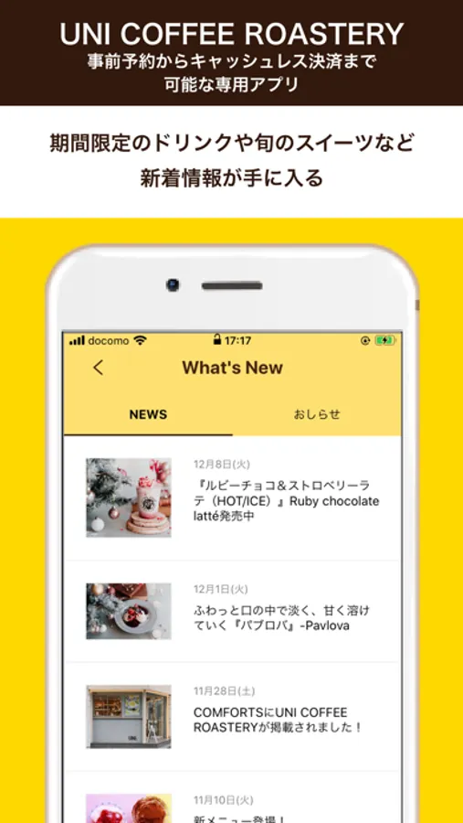 UNI COFFEE ROASTERYで好評の期間限定のドリンクや旬のスイーツなどの情報をいち早く入手できます。