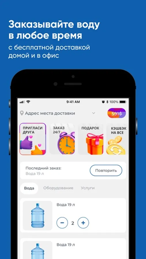 Скачайте бесплатное приложение на телефон и заказывайте чистую воду в удобное время!