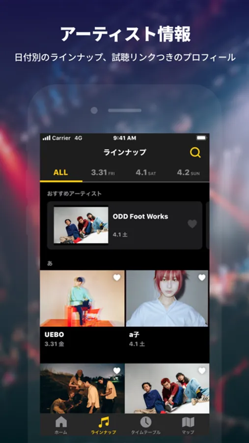 出演アーティストのラインナップを出演日別に確認できます。アーティストの詳細からはMVやApple Music、Spotifyなど各種ストリーミングサービスのリンクで楽曲のチェックができます。