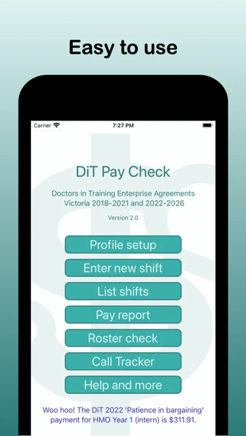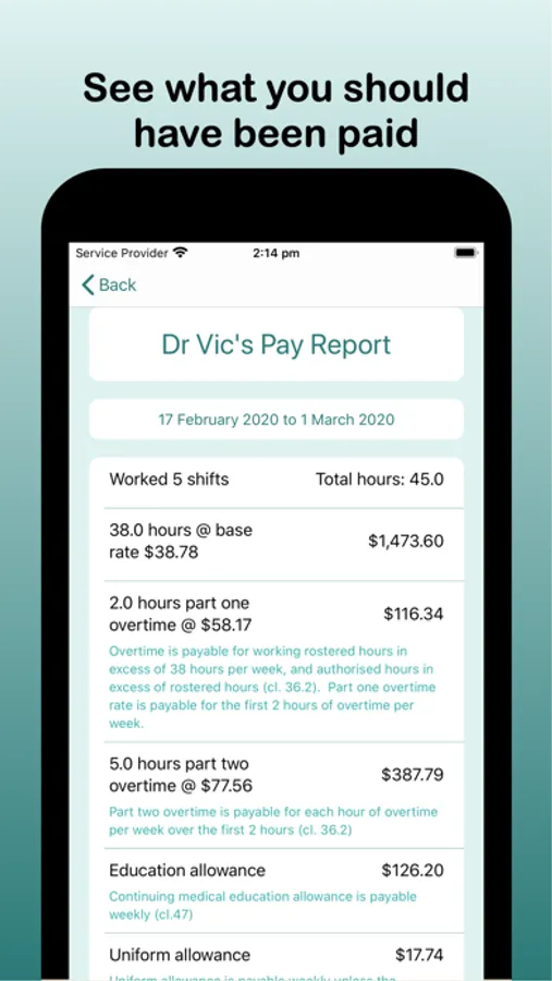 Simply set up your profile and preferences, enter your shifts, and let the app calculate your ordinary pay, overtime, night penalties, late finish penalties, short notice shift change penalties, public holiday and weekend penalties, on-call allowances, education allowances, meal allowances, uniform allowances, leave payments and more!