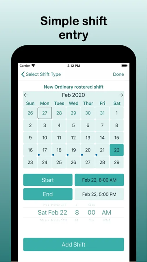 You can set default start/end times for both day and night shifts, for easy entry of multiple shifts. The app can automatically sync your shifts to your preferred calendar, for easy sharing with others.