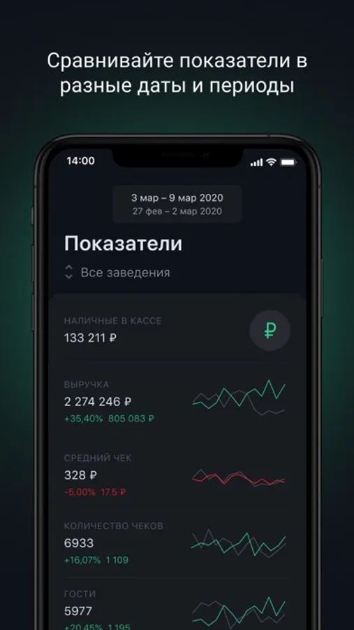 — Все важные показатели в виде графиков: выручка, прибыль, средний чек, количество гостей и количество чеков. Смотрите их в динамике по выбранным периодам.