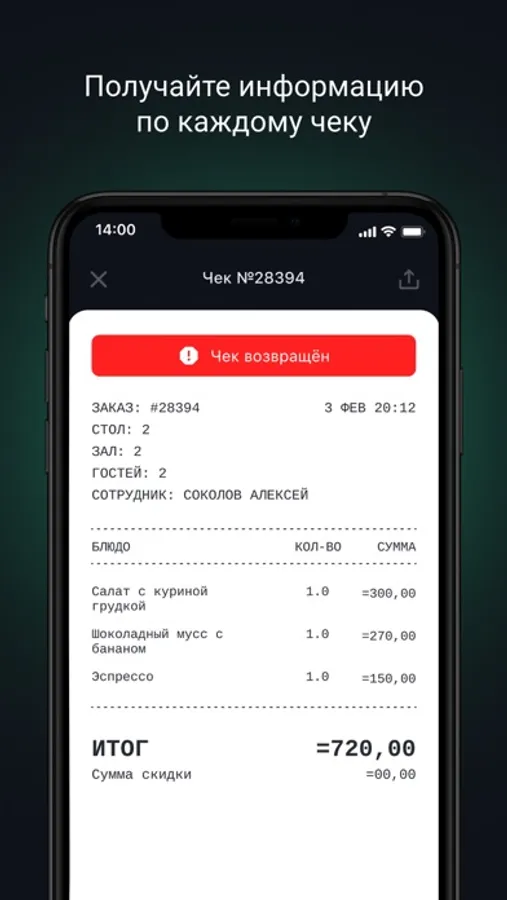 — Полная информация по каждому чеку: количество гостей, детали заказа, имя официанта, сумма скидки, отмена пречека и другое.