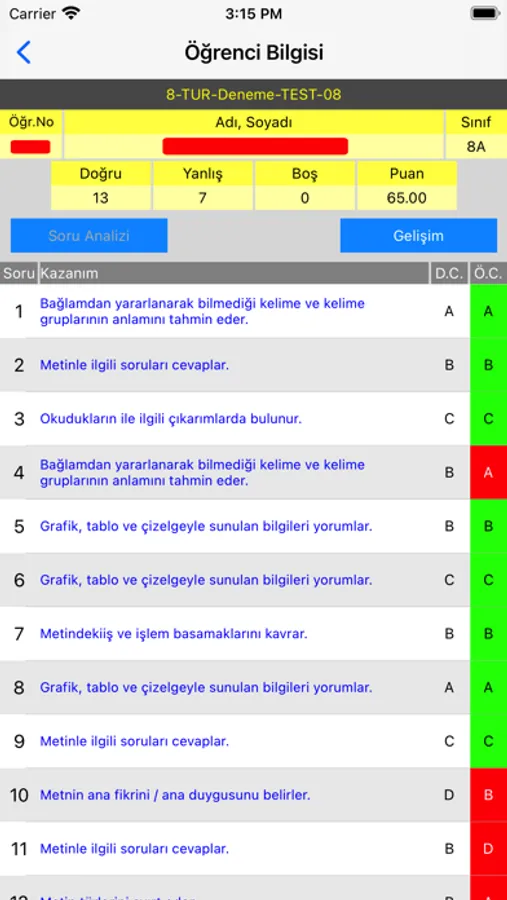 Öğrenci bazında soru ve kazanım analizlerini inceleyebilirsiniz.