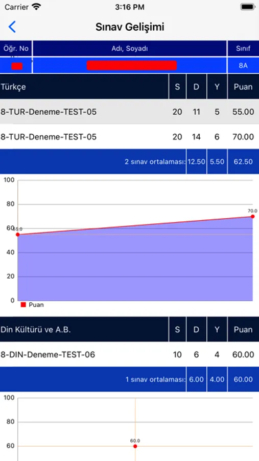 Öğrenci sınav gelişimini takip edebilirsiniz.