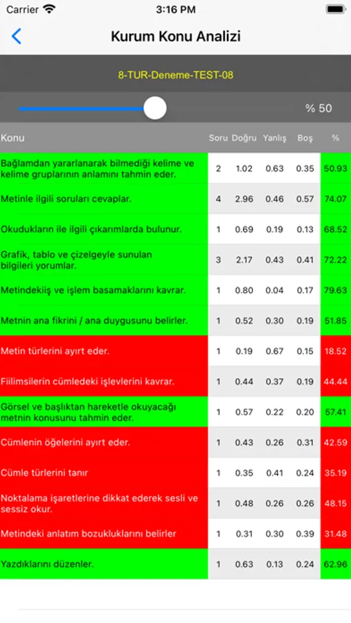 Kazanım analizleri ve soru analizleri üzerinde başarı oranını değiştirebilirsiniz.