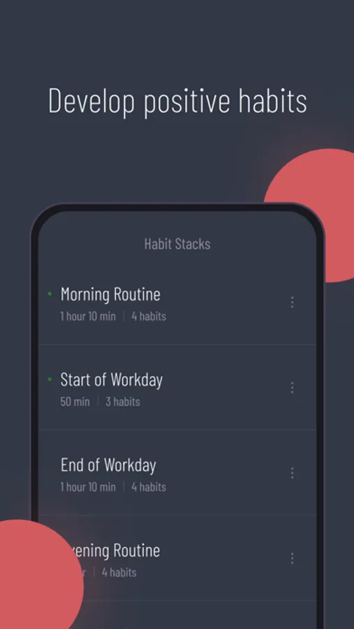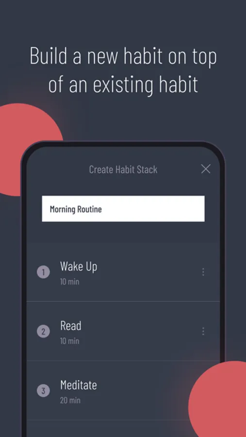 Say good-bye to streaks, chains, and other habit tracking techniques. With the HabitApp, you build new habits on top of the ones you already have by building a habit stack. Using the habit timer, we keep you on track when you're performing your habit. If you ever performed a HIIT workout or used a check-list, you have a sense of how this works. By identifying what habits you want to perform, allocating how much time each habit takes, you're allocating a time box. When you timebox habits, you'll find yourself effortlessly starting habit stacks each day and performing them automatically without using any willpower.