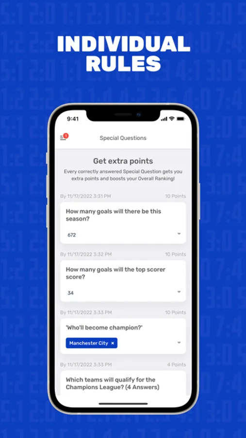 Predict the whole season of a league or the entire tournament. You can choose between European top leagues and international tournament highlights.