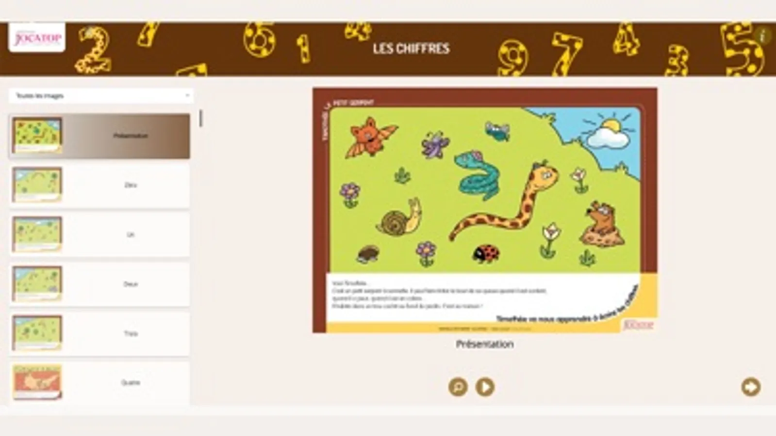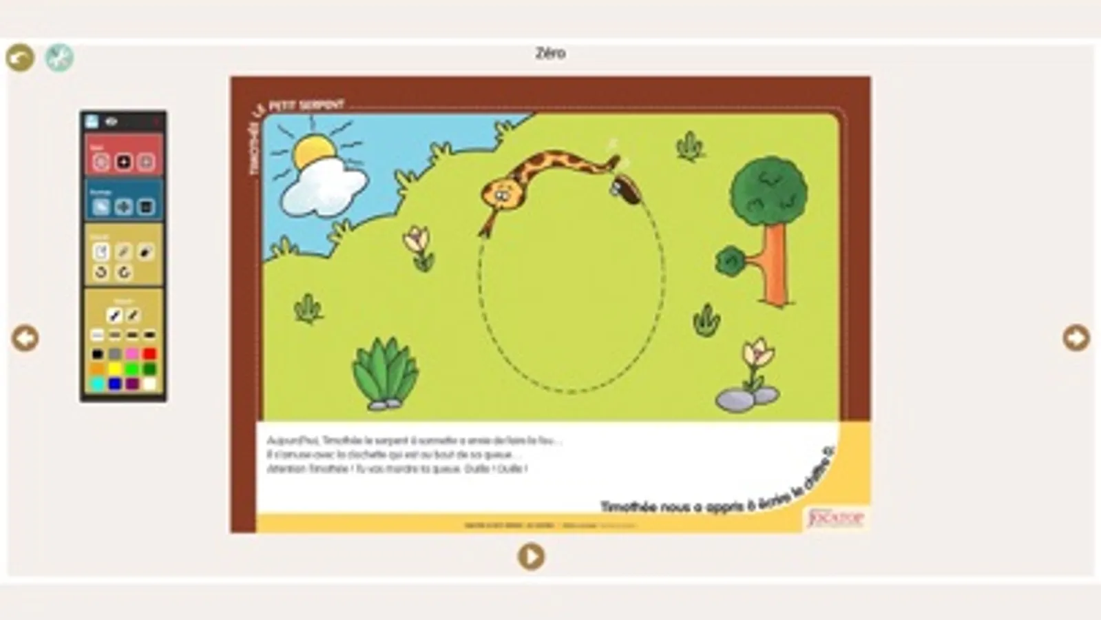 Timothée le petit serpent se promène dans son jardin. Ses rencontres, ses jeux, ses déplacements expliquent le tracé des chiffres aux élèves.