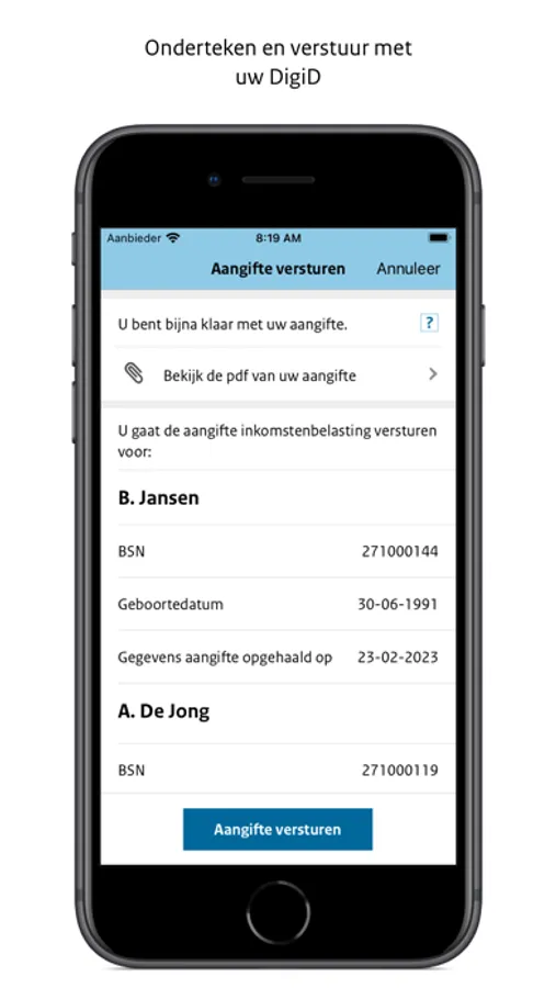 U haalt met uw DigiD uw gegevens op. Daarna controleert u ze. Klopt alles? Dan kunt u uw aangifte meteen ondertekenen en verzenden.
