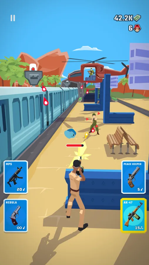 • Hold to shoot! Neat game mechanics make Agent Action easy to play but endlessly entertaining, with enough tactical challenges in weapon selection, targeting and fire-rate to keep more experienced players engaged. Between levels, you’ll have the choice between health boosters, armor or more awesome firepower, and your choice could be the difference between victory and death.