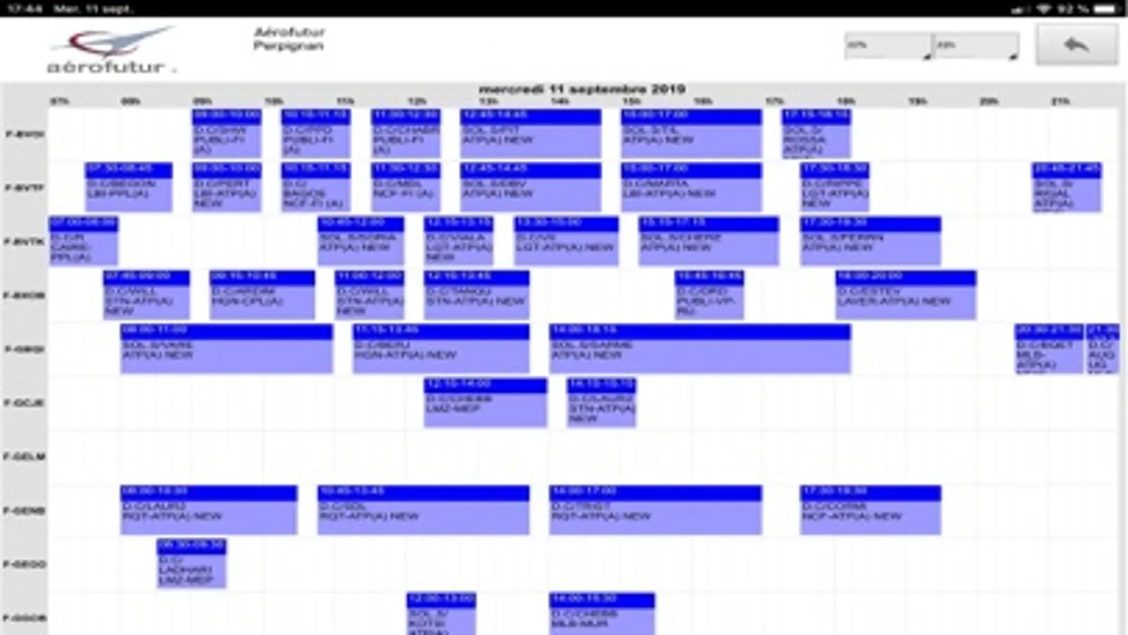 Planning affichant les différentes indisponibilités ainsi que les créneaux horaires concernant les avions, les simulateurs, les salles de classes, ainsi que les instructeurs, les stagiaires et les membres du personnel.